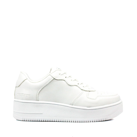 Zapatilla urbana confeccionada en cuero ecológico color blanco. Base de goma color blanco. Altura de la base: 4,5cm. Plantilla acolchonada.